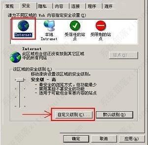 补充说明:还可以在“Internet选项”中切换到“安全”选项卡中——>点击第一个图标“Internet”——>直接点击“默认级别”后,确定退出即可。