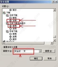 第三步:在弹出的“安全设置”下方找到“文件下载”——>将其设置为“启用”——>并将下面的“文件下载自动提示”设置为“禁用——>将最下方的“重置自定义级别”设置为“安全级-中”——>点击“确定”退出。