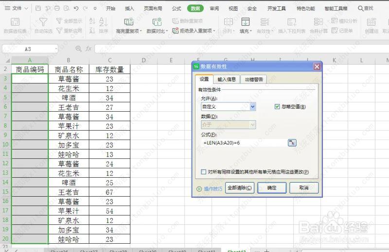 在出现的数据有效性对话框设置项下,允许下拉列表中选择“自定义”,然后在公式文本框中输入“=LEN(A3:A20)=6”。