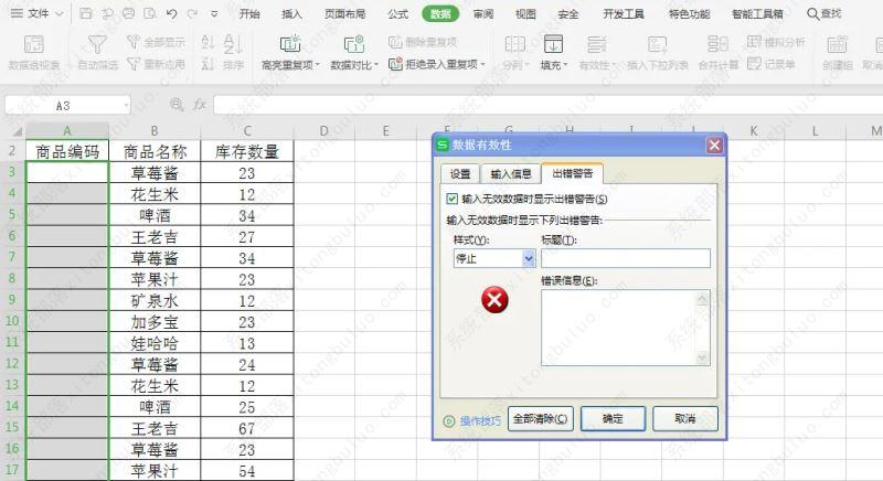 打开一个“商品记录表”,含有“商品编码”、“商品名称”及“库存数量”,我们现在需要设置录入的商品编码为6位数据。