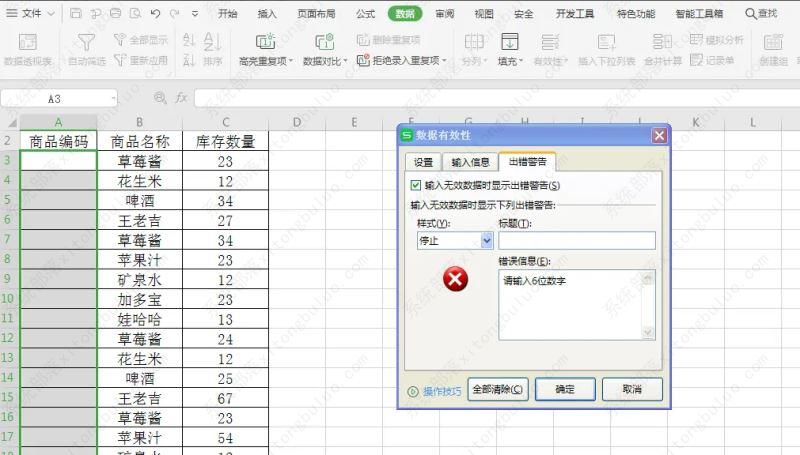 接着单击选中出错警告项,然后在错误信息下的文本框中输入“请输入6位数字”,然后单击确定。
