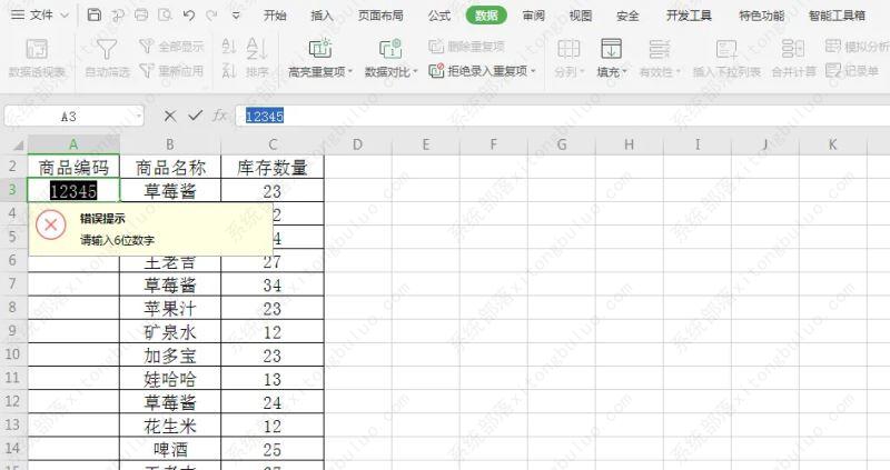 当我们在“商品编码”列下录入5位数字时,表格中就会出现错误提示。