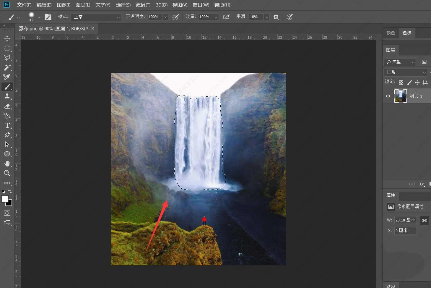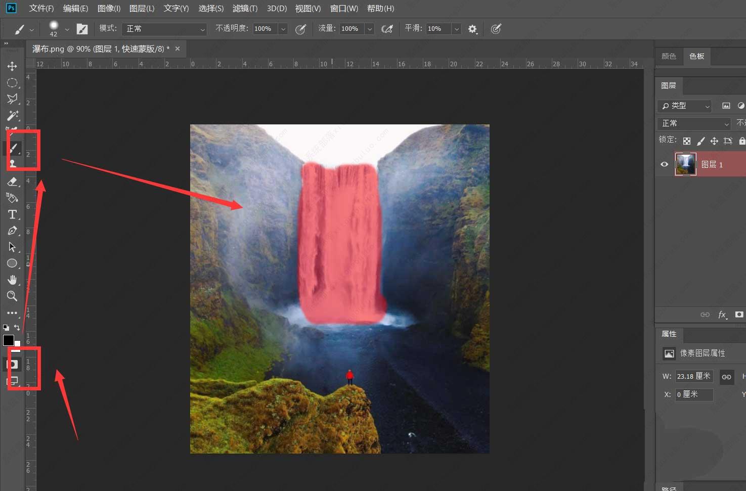 然后点击工具栏的快速蒙版图标,进入快速蒙版,用画笔工具将瀑布涂抹出来。