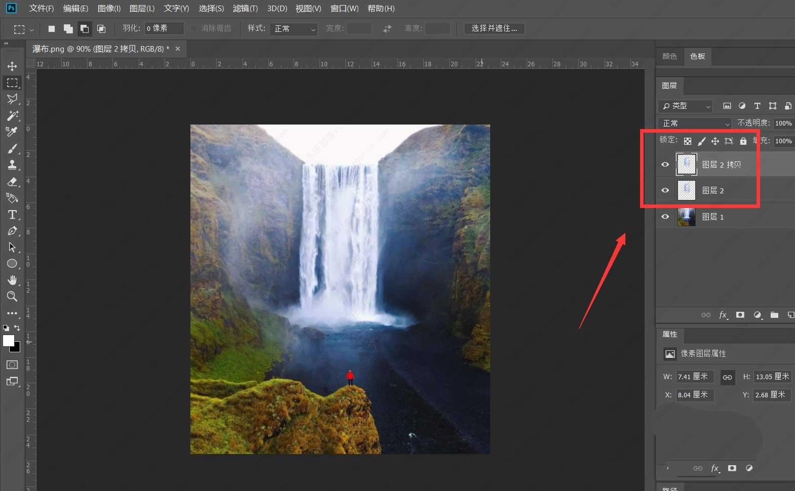 接着点击退出快速蒙版,将瀑布选区复制两次。