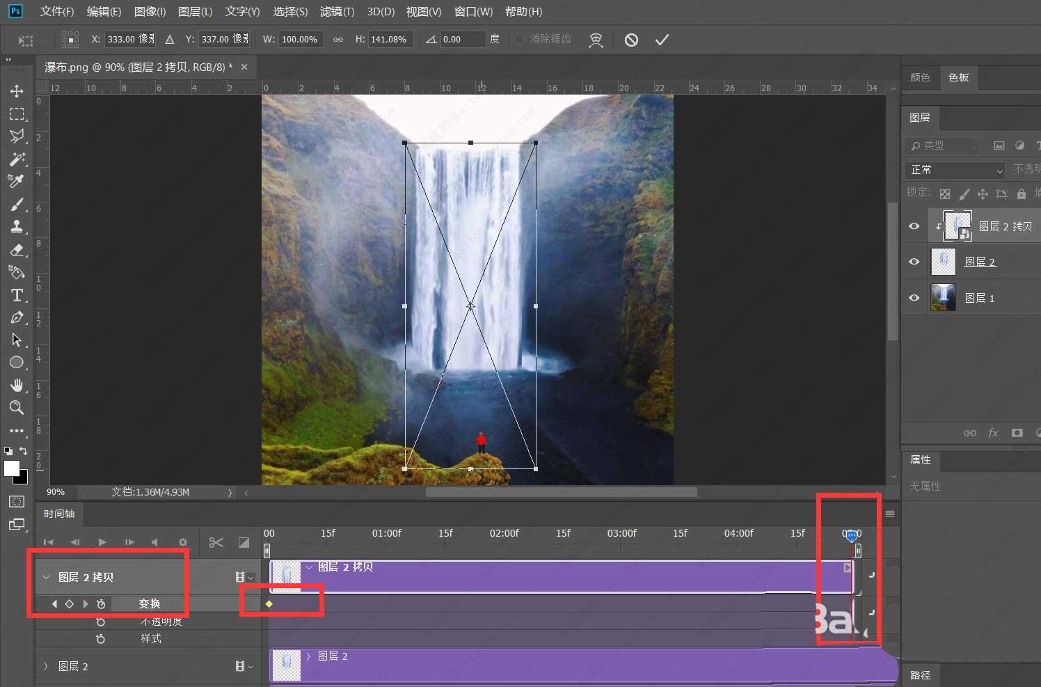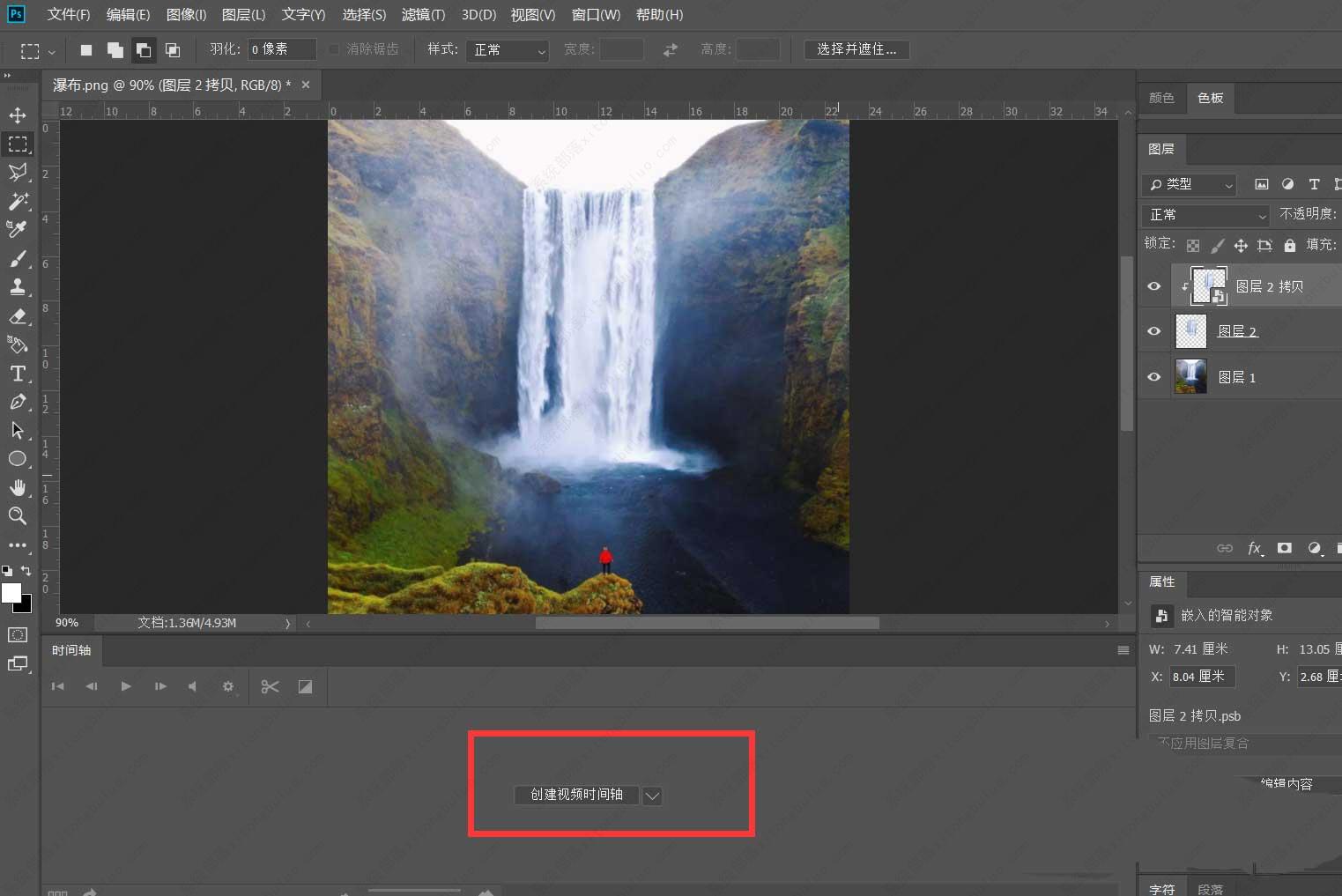 然后依次点击窗口——【时间轴】——【创建时间轴】,将最上层图层时间轴点开,在起始位置点击【变换】,将滑杆移动到时间轴末端,按ctrl+t拉长瀑布。