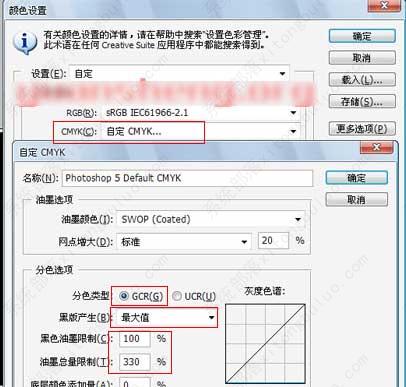 先转成RGB格式,然后点击[编辑-颜色设置],在对话框中CMYK那栏选择“自定CMYK”,在弹出的对话框中分色“GCR”、黑版产生“最大值”,黑色油墨限制100%,油墨总量限制330。然后将图重新转为CMYK模式。这时候文字就只有在K版中有了。 不过需要注意一下其他部分的效果。还有,转完后把颜色预置改回你常用的设置。