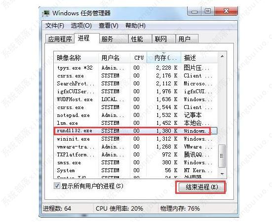 注意:如果有多个rundll32.exe进程,需要将多个rundll32.exe进程全部关闭。