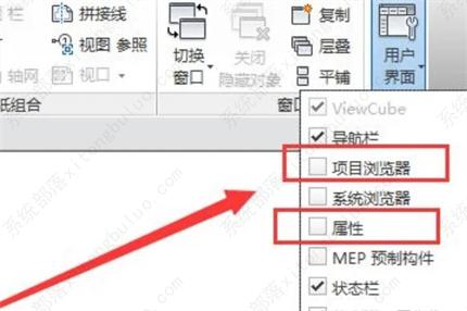 4、当点开了“用户界面”以后,在弹出来的选项里就可以看到项目浏览器和属性栏前面的方框是空的,需要将其勾选起来,如下图所示。