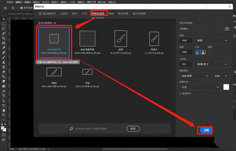 接着在打开的新建文档选项卡点击“图稿和插图”选项后选择“1000像素网格”选项即可。