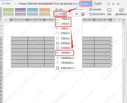 3、接着我们继续点击顶部工具栏中的“表格样式”,选择“边框”下的“下框线、上框线和内部框线”选项。