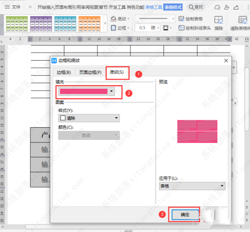 7、接着,在小窗口中将底纹颜色设置成粉色,然后点击确定。