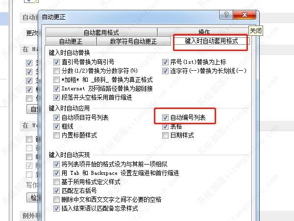 第三步:在“键入时自动套用格式”选项卡中取消【自动编号列表】勾选即可。