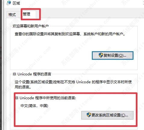 4、在“管理”页面中找到“更改系统区域设置”。