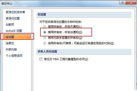 首先在在“Office共享功能”中有“Visual Basic for Application”要安装VBA编辑器的,启动Excel后,选左上角的大点,Excel选项-》信任中心-》信任中心设置-》宏设置-》“禁用所有宏,并发出通知”,如图所示: