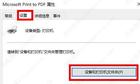 5、在属性界面中点击“设置”任务栏,并点击下面的“设备和打印机文件夹”。