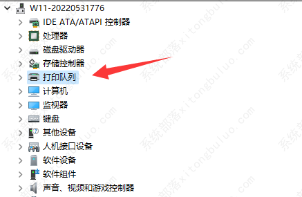 3、点击设备管理器中的“打印队列”。