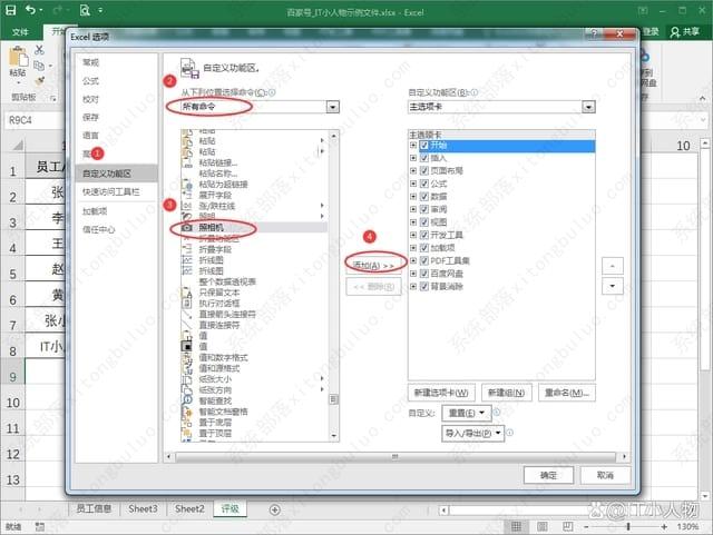 2、在“选项”界面中点击【自定义功能区】,选择【所有命令】,找到【照相机】,点击【添加】按钮,将“照相机",添加到主菜单下;
