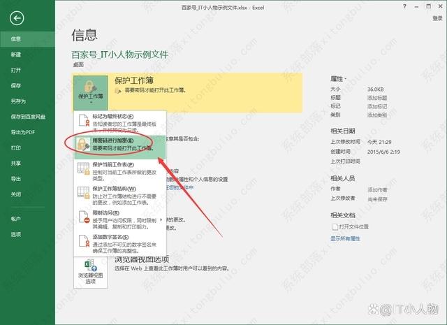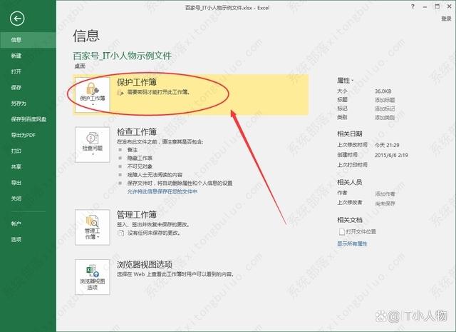 3、在“信息”界面中可以看到黄色标识出“保护工作簿”需要用密码打开;