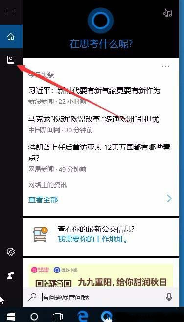 2、这时会弹出小娜搜索框,点击左侧边栏的“笔记本”图标,如下图所示: