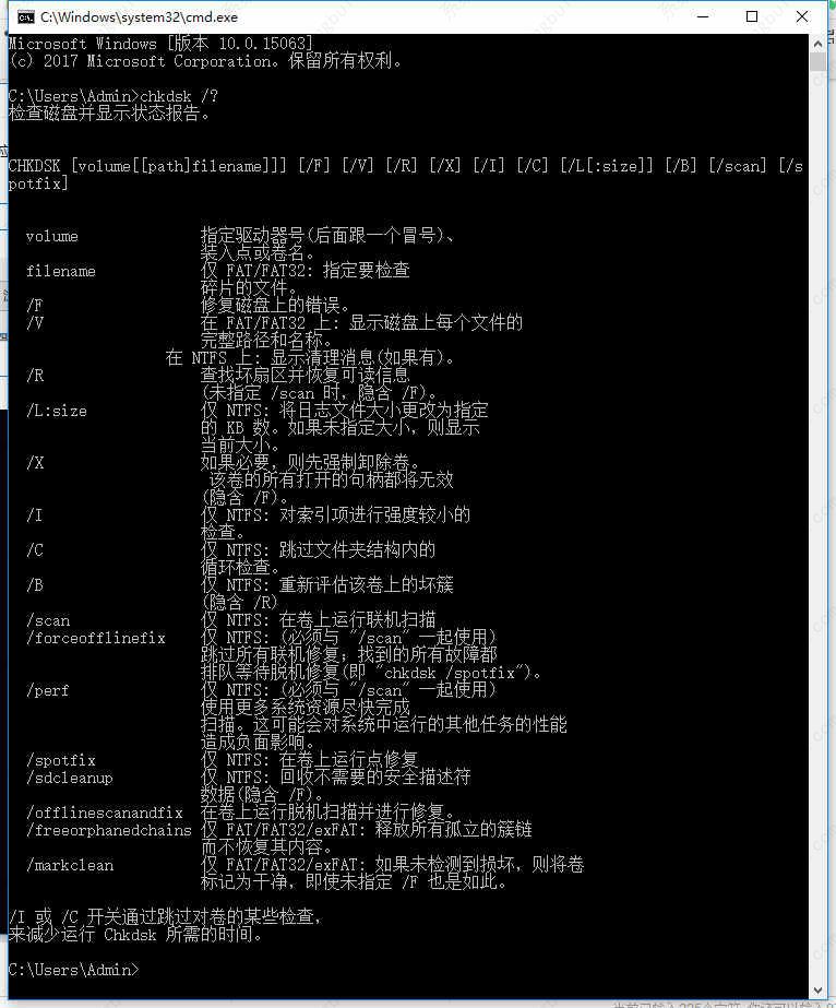 /offlinescanandfix 在卷上运行脱机扫描并进行修复。