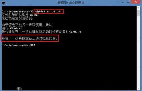 如果要对当前系统盘进行磁盘检测与修复的话,由于系统在运行当中,有很多进程占用,所以系统会提示在下一次系统重启时检查,按键盘上的“Y”键继续。