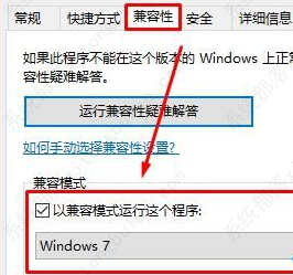 2、切换到【兼容性】选卡,在下面勾选【以兼容模式运行这个程序】,在下拉菜单中选择【Windows 7】点击确定。