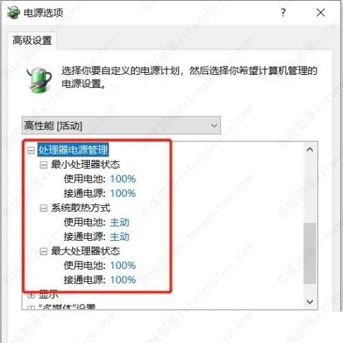 在打开的窗口中,找到并点击处理器电源管理,将最小处理器状态设置为100%,系统散热方式设置为主动,最大处理器状态设置为100%,即可解决CPU降频的问题。
