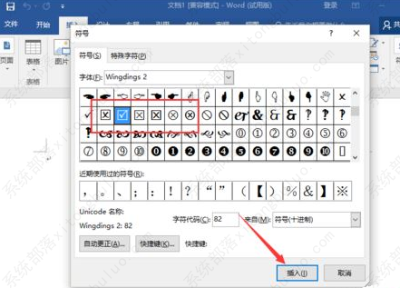 5、在符号窗口中,将符号下的“字体(F)”选择为“Wingdings 2”,接着滑动滚动条,找到带“打勾”或者“打叉”的小方框。然后选择需要插入的符号,再点击“插入”按钮。