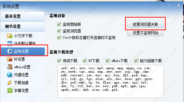 3、打开迅雷配置中心后,选择“监视设置”,点击“修复浏览器关联”。