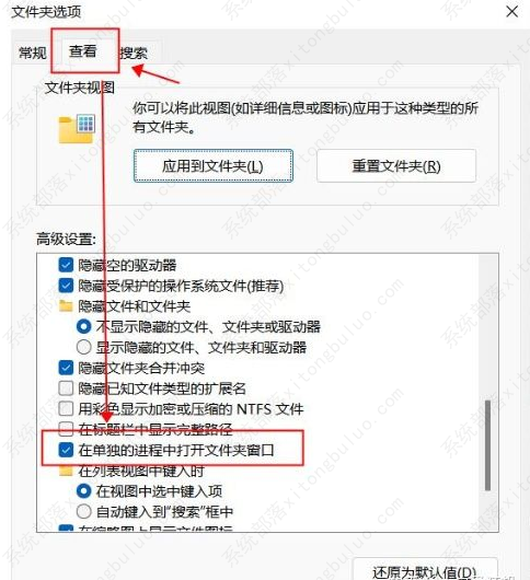 4、最后进入新界面中的“查看”选项中,找到“高级设置”下方的“在单独的进程打开文件夹窗口”并将其勾选上,点击确定保存即可解决问题。