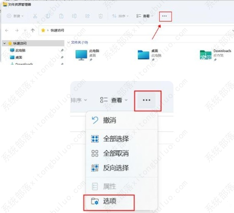 3、然后将电脑进行重启,按下快捷键“win+e”进入文件资源管理器,点击上方的“。。。”图标,点击下方的“选项”。
