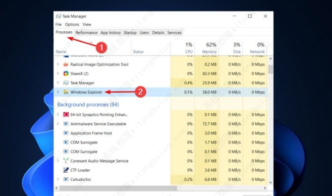 2、进入“Processes”进程选项卡中,找到“Windows Explorer”文件资源管理器,右击选中将其关闭。