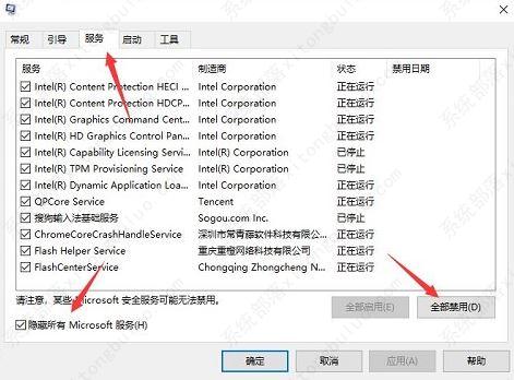 2、在新界面中,点击顶部的“服务”选项卡,找到左下角的“隐藏所有 Microsoft 服务”将其勾选上,并点击“全部禁用”。
