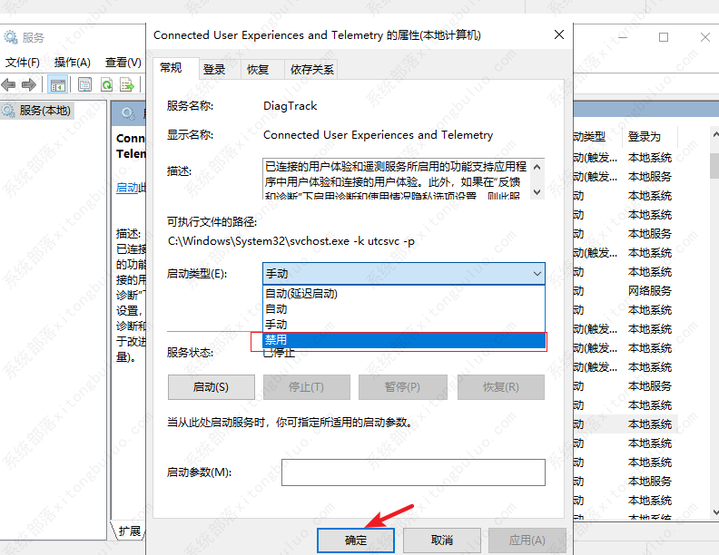 2、弹出以下界面后,下拉找到“Connected User Experiences and Telemetry”并双击打开,将启动类型设置为“禁用”,然后点击“确定”结束该服务。