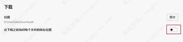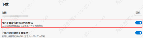 3、找到“在下载之前询问每个文件的保存位置”选项,将其右侧的开关按钮打开即可。