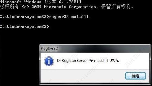 4、在窗口中输入”regsvr32 msi.dll“命令,回车键执行,当有弹窗提示”DllRegisterServer在msi.dll已成功“,即成功解决问题。