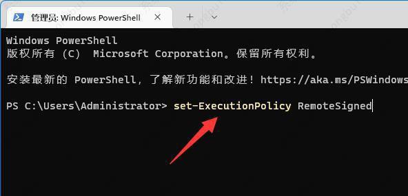 2、进入窗口后,在其中输入“set-ExecutionPolicy RemoteSigned”命令,回车键执行。