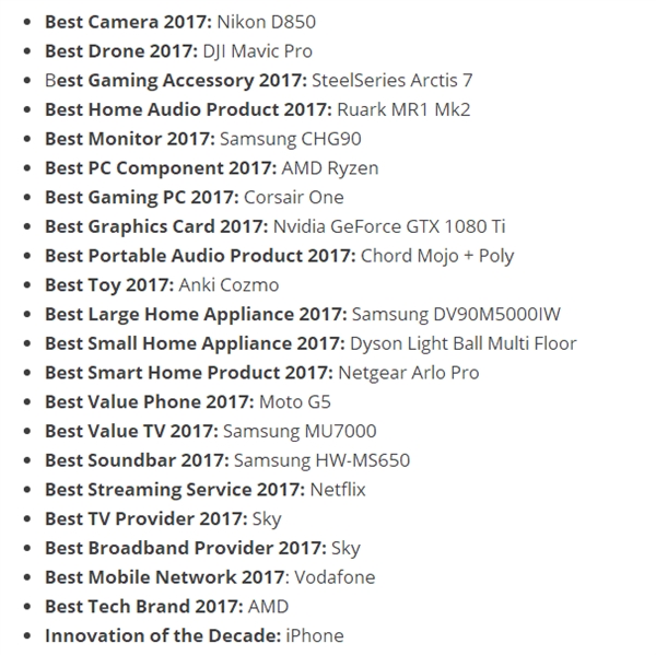 另外,TR也选出了年度最佳显示器三星CHG90、最佳无人机大疆Mavic Pro、年度产品任天堂Switch、最佳手机三星Galay S8、最佳平板iPad Pro 10.5、最佳电视LG B7、最佳笔记本联想IndeaPad 720S。