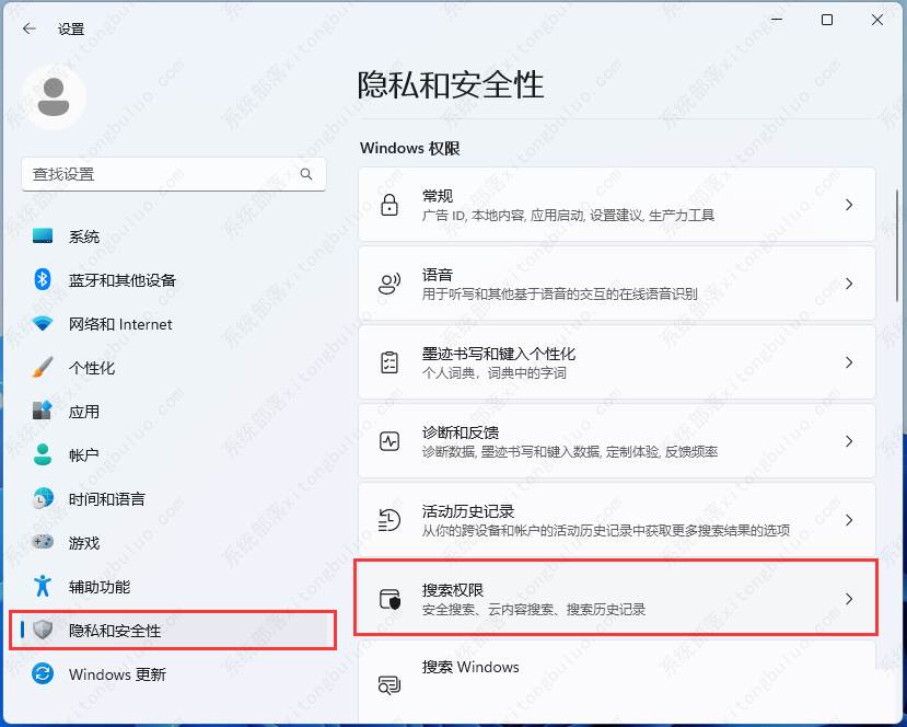 2、设置窗口,左侧点击【隐私和安全性】,右侧点击【搜索权限(安全搜索、云内搜索、搜索历史记录)】;