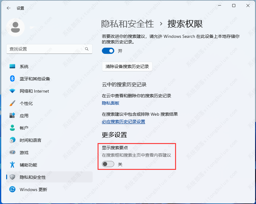 3、当前路径为:隐私和安全性 》 搜索权限,最底下找到更多设置,然后滑动滑块,将显示搜索要点【关闭】,这样在搜索框和搜索主页中就不会显示内容建议了;