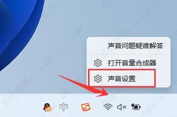 1、右键点击任务栏右下角的【声音图标】,在打开的菜单项中,选择【声音设置】;