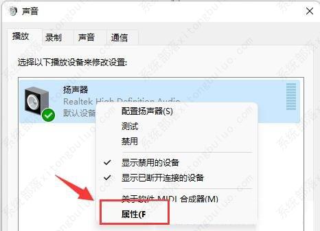 3、声音窗口,右键点击扬声器,在打开的菜单项中,选择【属性】;