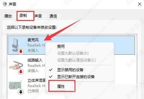 5、声音窗口下,切换到【录制】选项卡,选择麦克风后,点击【右键】,在打开的菜单项中,选择【属性】;