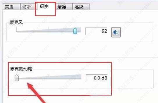 6、切换到【级别】选项卡,将麦克风加强修改为【0】即可。
