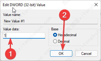 4、双击打开刚刚新建好的值,在窗口中将数值数据改为“1”,点击确定即可。