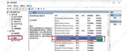 2、在打开的“计算机管理”窗口中找到左侧的“服务”项,然后在右边的列表中找到“HomeGoup Listener”与“HomeGroup Provider”服务,双击打开;