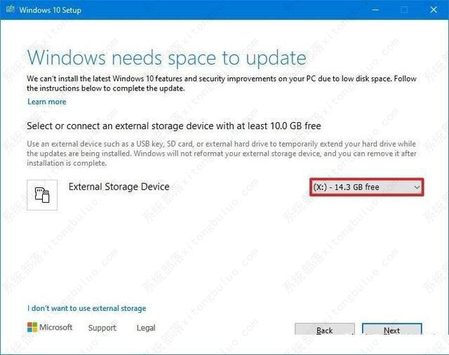 9、在“ Windows需要更新空间”部分下,使用“外部存储设备”下拉菜单,然后选择空的U盘。