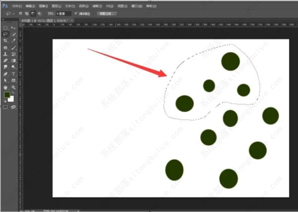3、取消选择(ctrl+D)。现在要把上面4个圆形移动到画布右侧,用套索工具(L)圈住上面4个圆形形成一个选区。