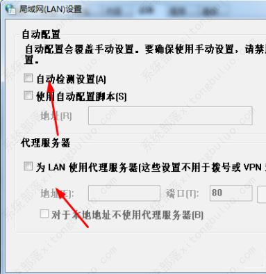 4、打开“局域网(LAN)设置”窗口后,取消所有复选框中的勾选,点击确定即可。