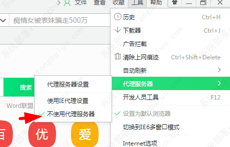 5、再次打开浏览器的工具菜单,代理服务器中选择中不使用代理服务器。